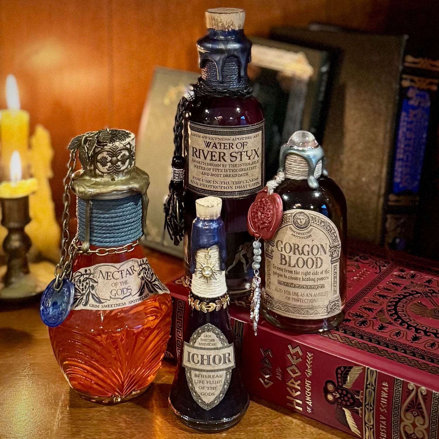 We've been splashing around in the pools of Greek Mythology, and have updated our current collection, including a brand new Nectar of the Gods! We are brainstorming ideas for further Mythology potions, but for now we've made up the must-have classics; Water of the River Styx, Ichor, Gorgon Blood, and Nectar of the Gods.