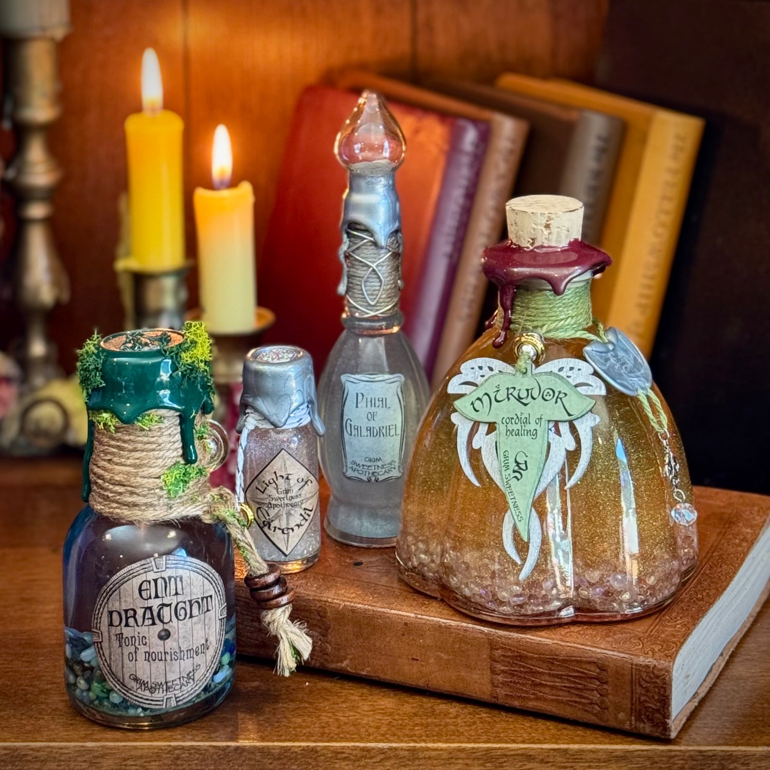 This collection features The Phial of Galadriel, a mini fidget potion of the Light of Earendil (the same substance in Galadriel's phial), and an updated design of both Miruvor, and Hobbit sized Ent Draught.