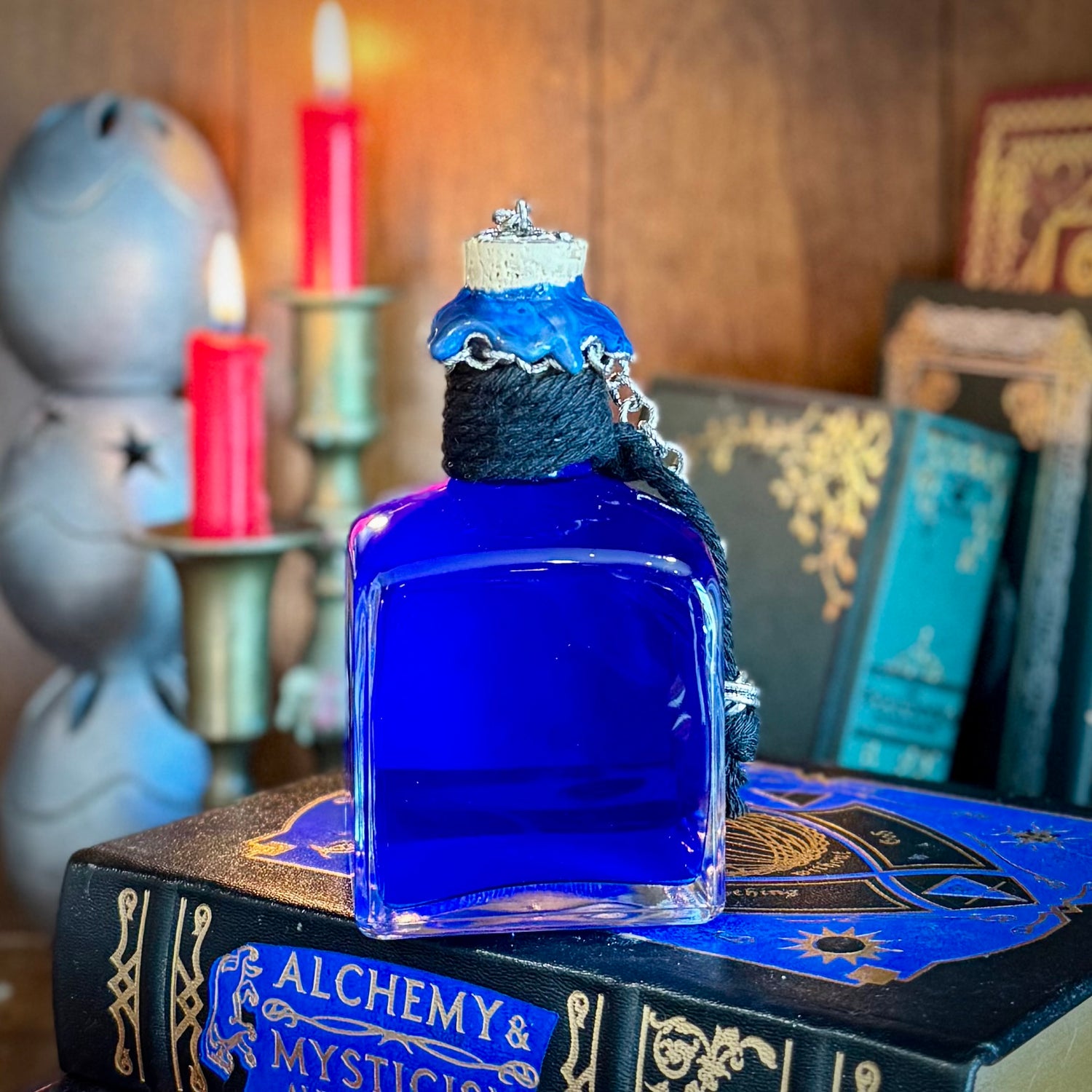 -Square glass bottle is full of a deep rich purplish blue potion that changes to a swirling light blue with silvery highlights and deeper blue lowlights.