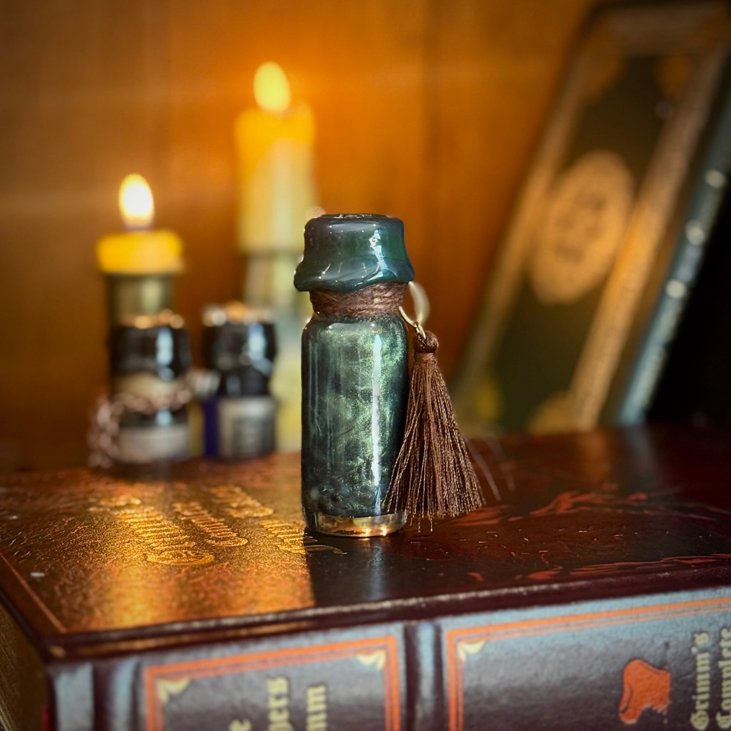 Such a secretive little potion, full of woodland magic and hushed whispers. The colors of this one are inspired by the deep twilight- and premature darkness- of the forest and the green gold of sunshine through the branches.