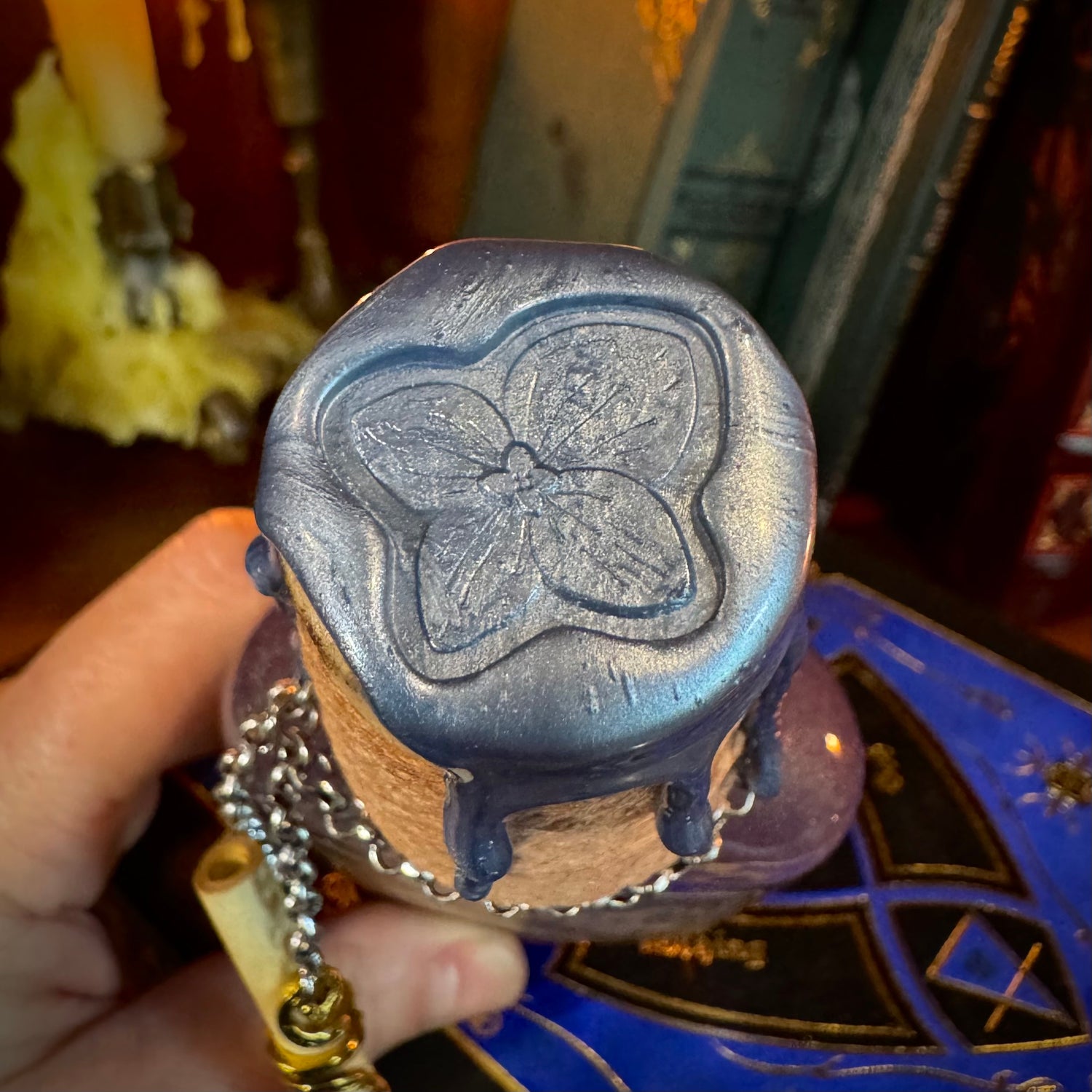 -Aged wooden stopper is sealed with waterproof glue and drizzled with silver-blue wax and stamped with a flower stamp.