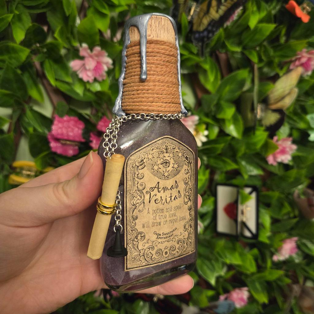 -Hand-designed and aged label reads: "A potion and spell of true love. Will draw or repel love." It's sealed with water-resistant sealant for durability.