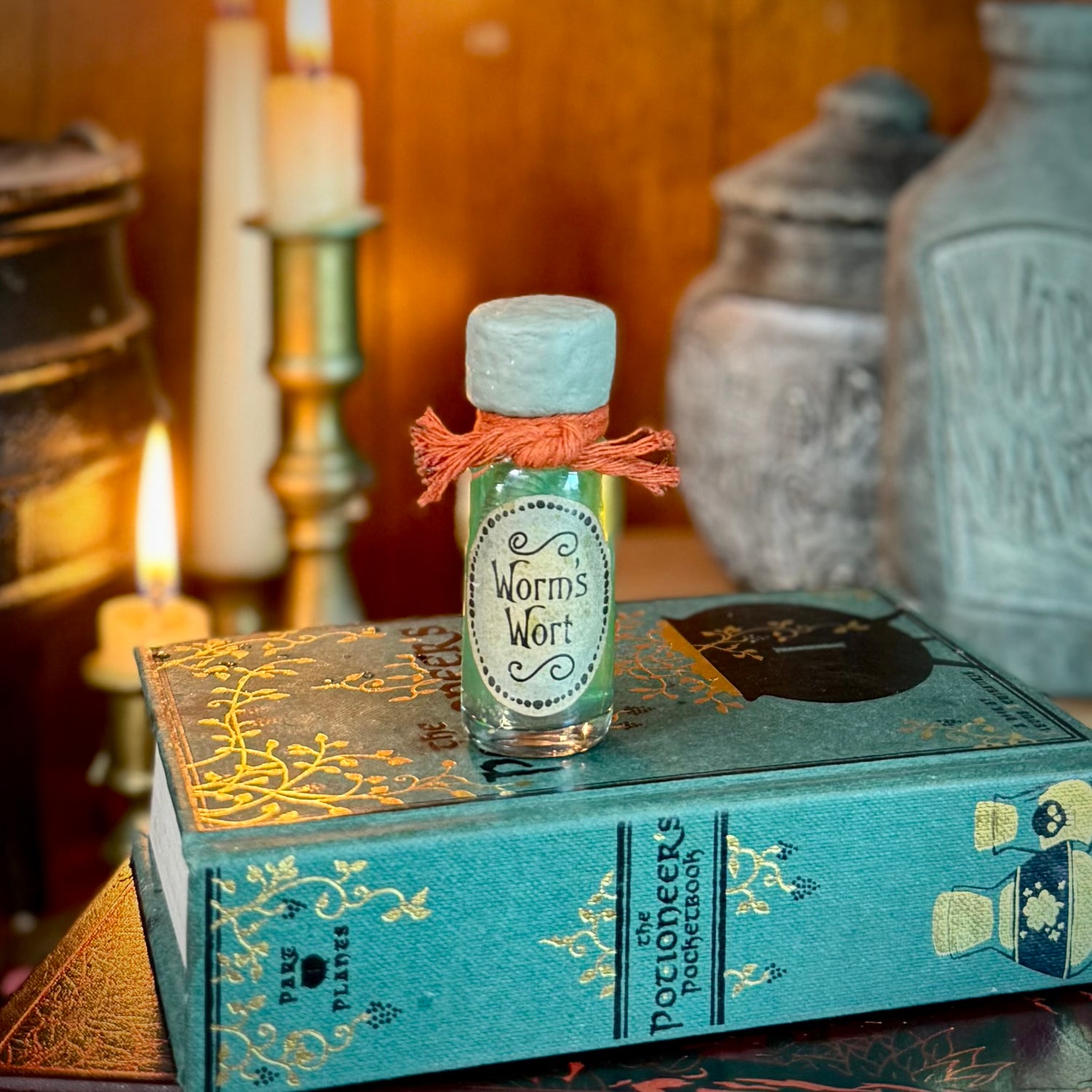 Worm's Wort- Murky green potion has glow-in-the-dark worms floating in it, changes to a smoky purple when shaken. Finished with an aged burnt orange cord with a ring attached to the back, and clay top.