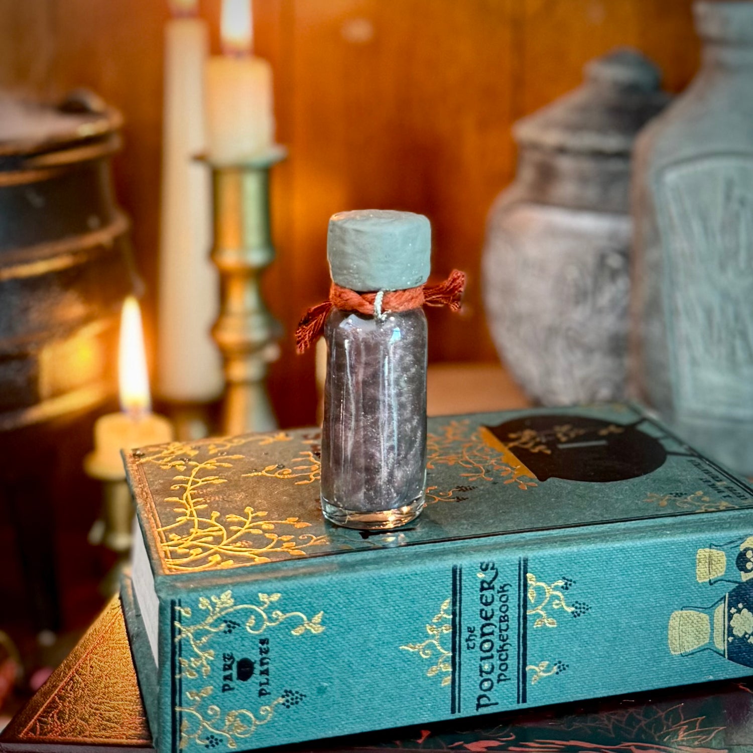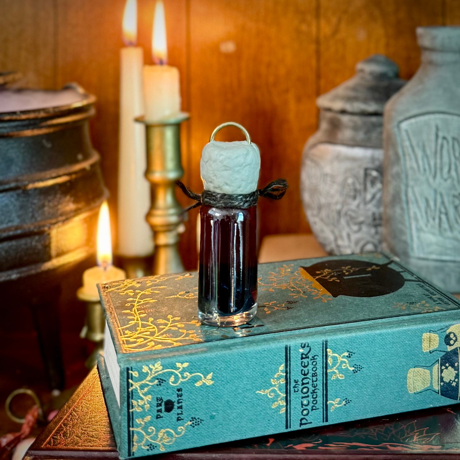 Deadly Nightshade- Deep dark red potion swirls to a deep blue purple when shaken, has black glass nuggets that tinkle around in the bottom. Finished with a black twine, a clay top and bronze ring secured in the clay.
