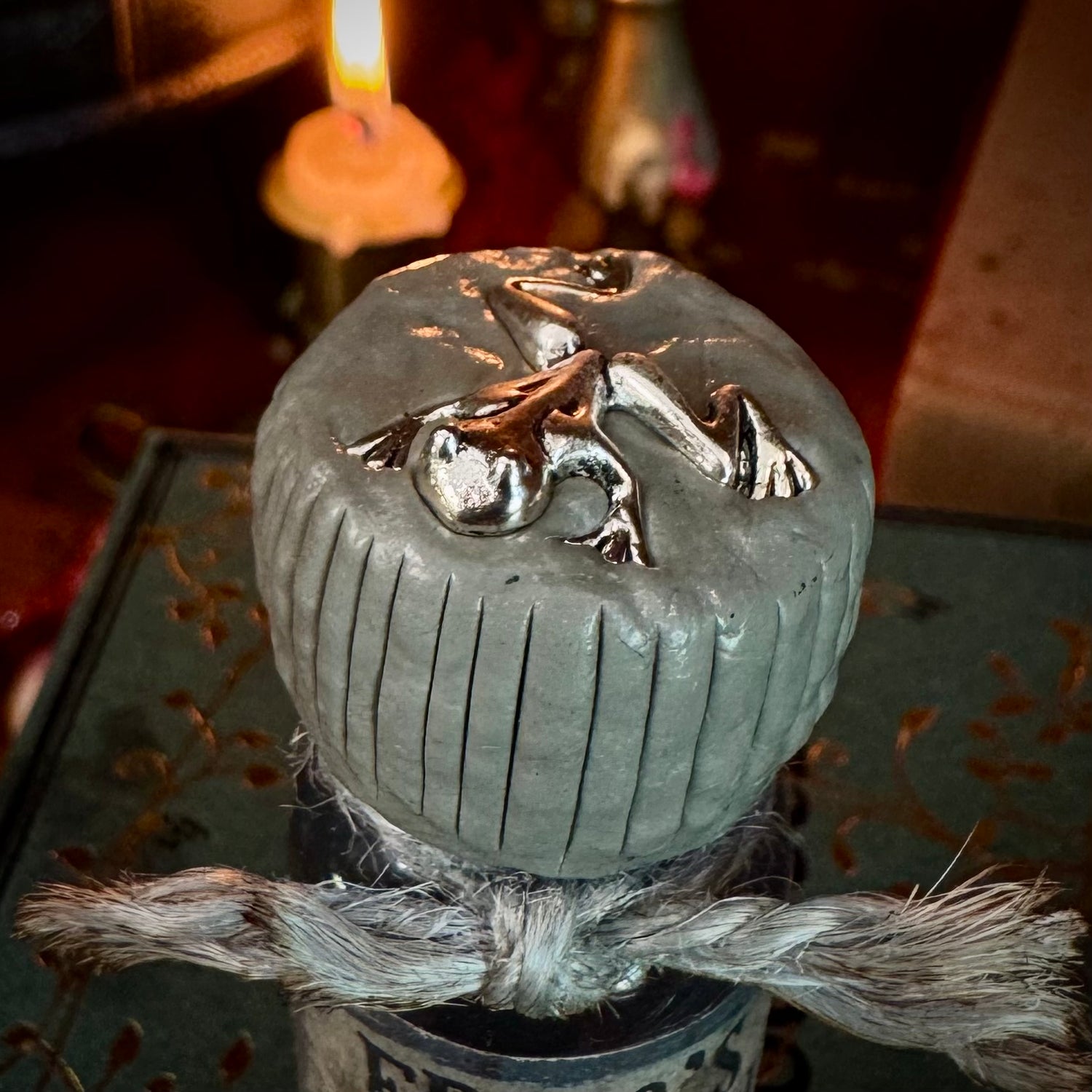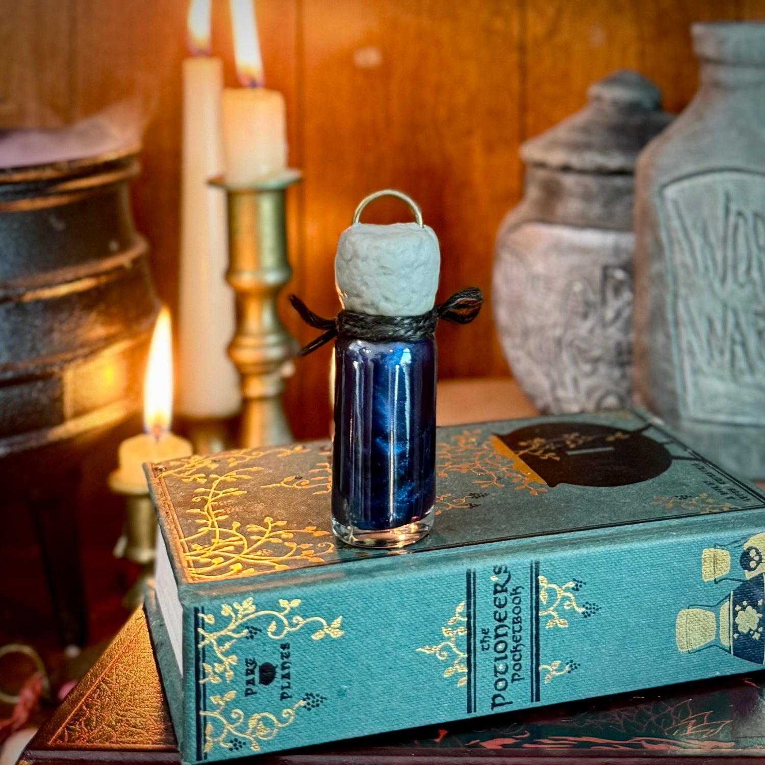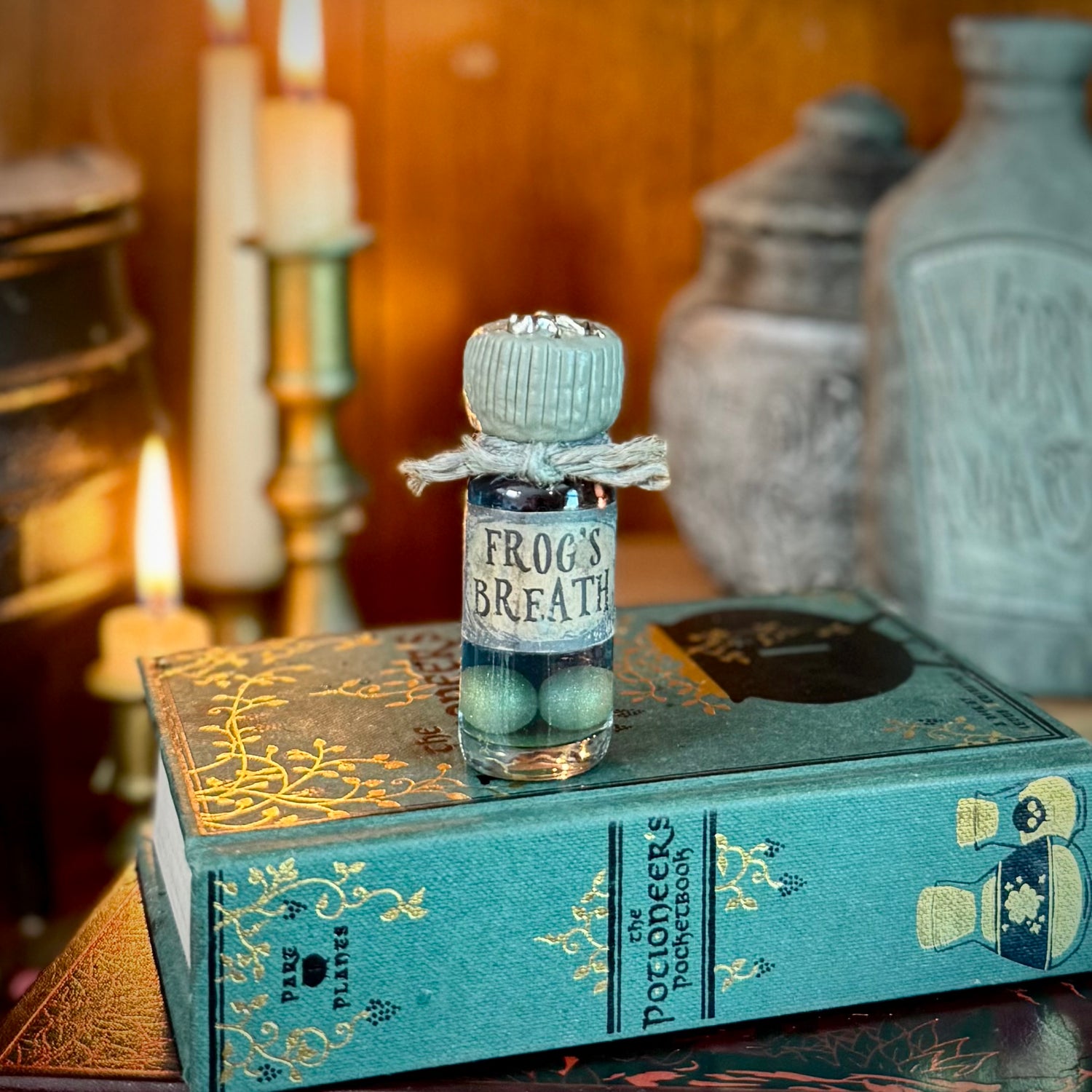 Frog's Breath- Blue potion has two glow-in-the-dark orbs floating in it, changes to a swirling green when shaken. Finished with aged grey twine with a ring attached for hanging, and a clay top with a silver toned metal frog set into it.