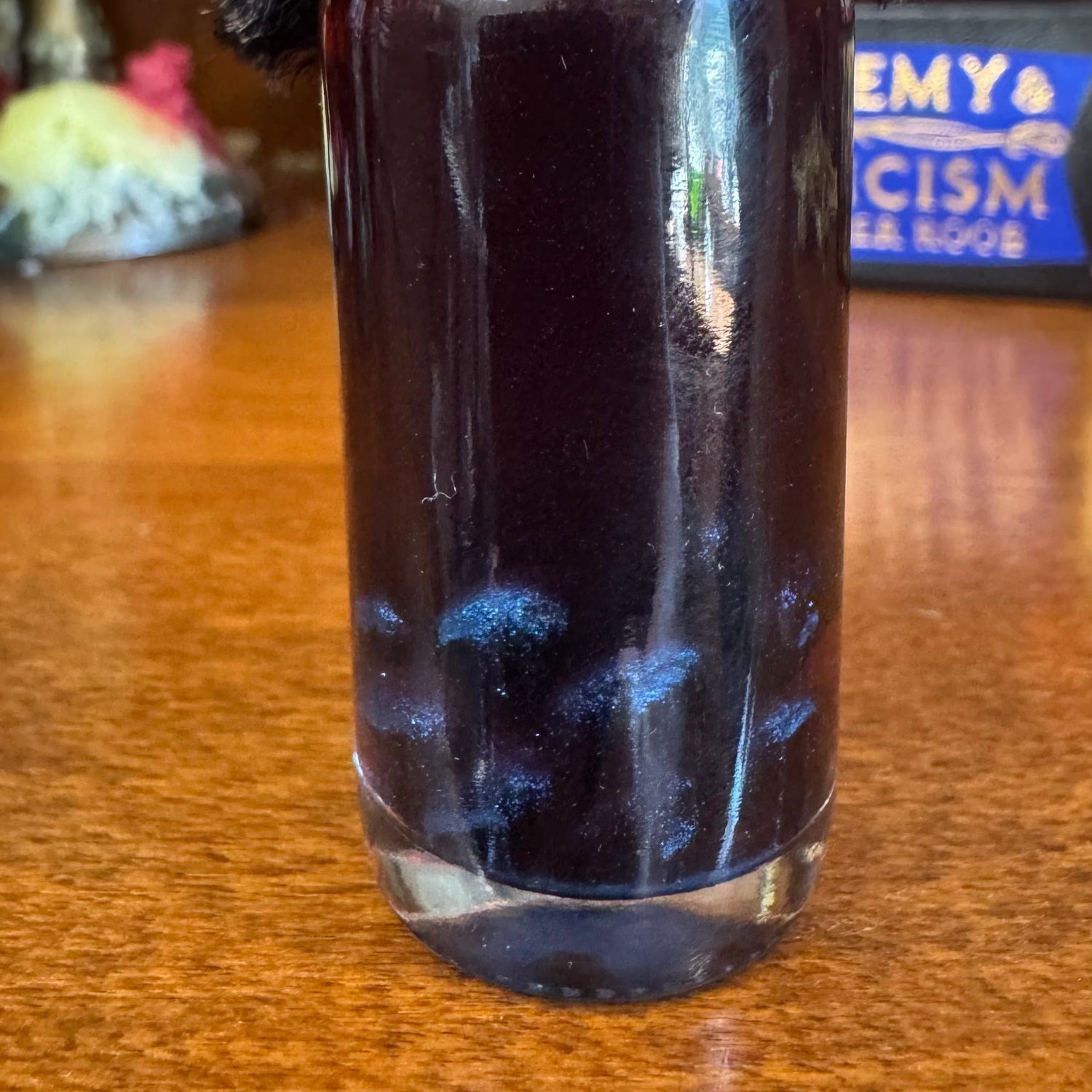 -Mini glass bottle full of a deep, dark red liquid with black glass nuggets resting in the bottom. Changes to a deep blue-purple when shaken up, and the nuggets make a delightful sound. Settles back to red in about 20 minutes, and will continue to color change indefinitely.