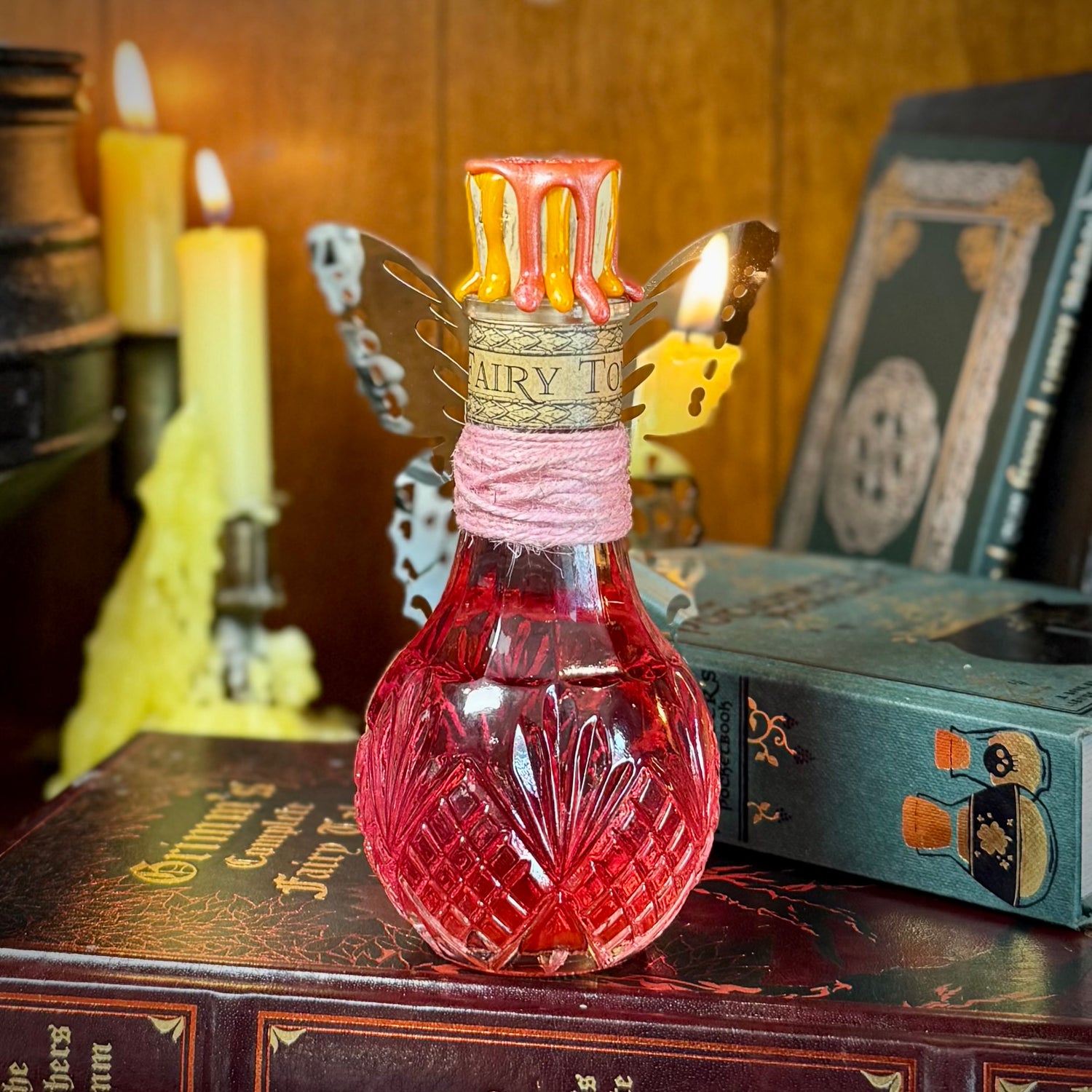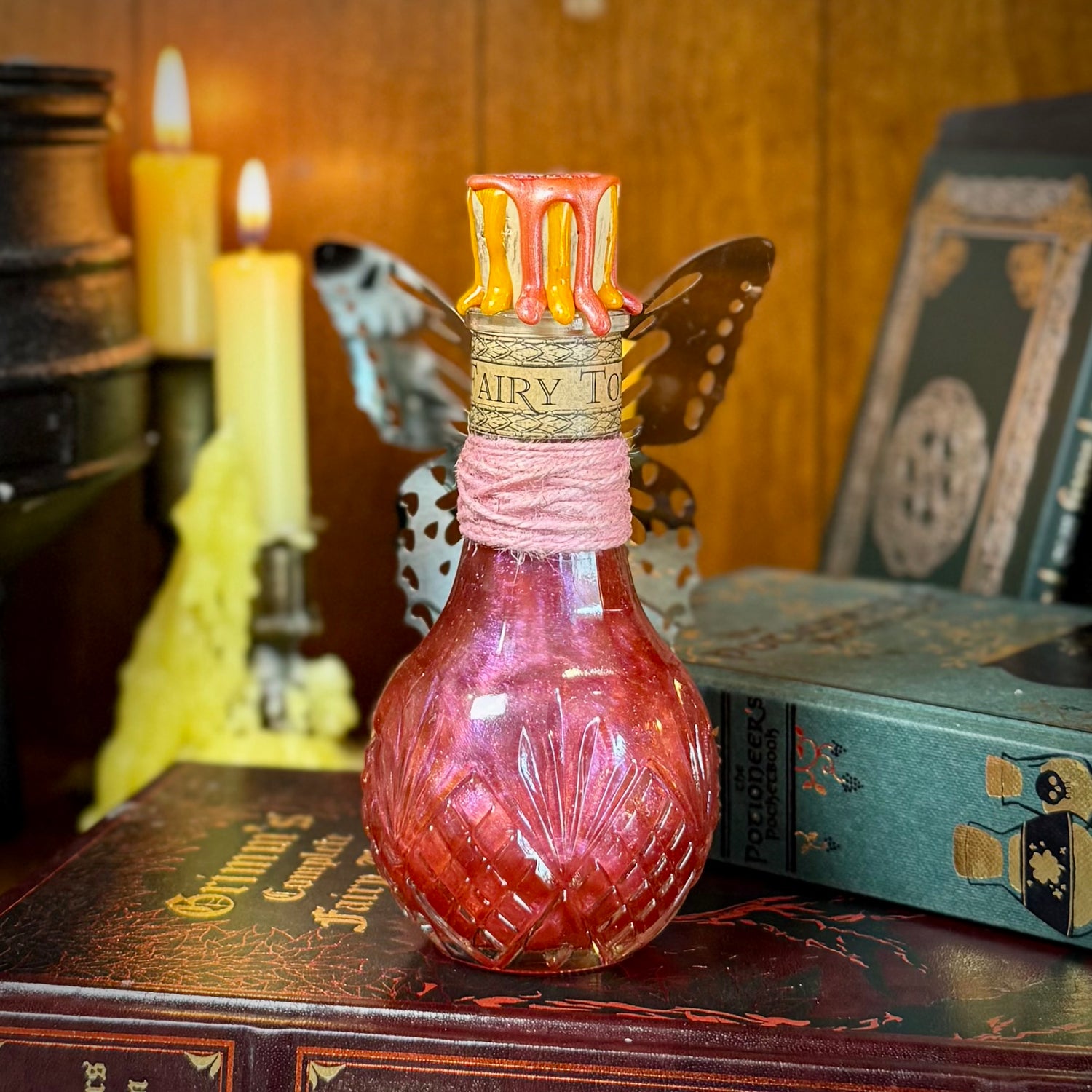 I create life size, realistically magical potions that look like they live in the wizarding world or a wizened old alchemists workshop. They’re intended to look old and worn, while still pretty. I hand age the labels, so they are faded and stained. Some are more stained and older looking than others, your collection will look authentic.