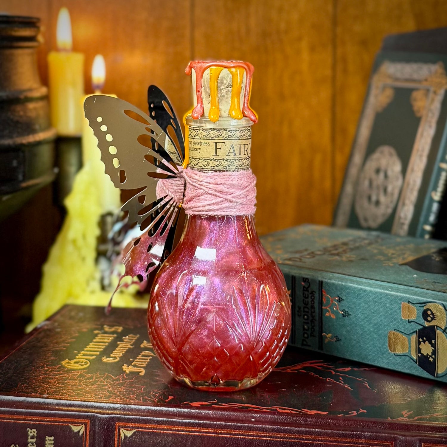 -Aged cork is sealed with waterproof glue and drizzled with a layer of iridescent orange wax, and a layer of iridescent pink wax and stamped with a fairy wax stamp that's highlighted in silver.