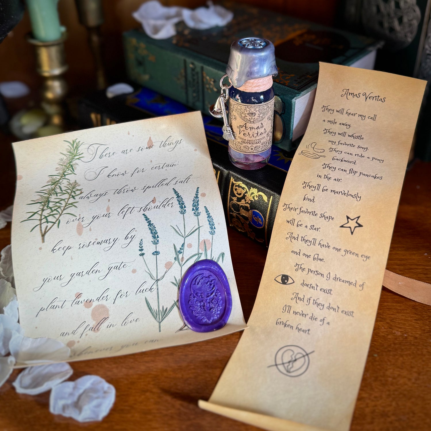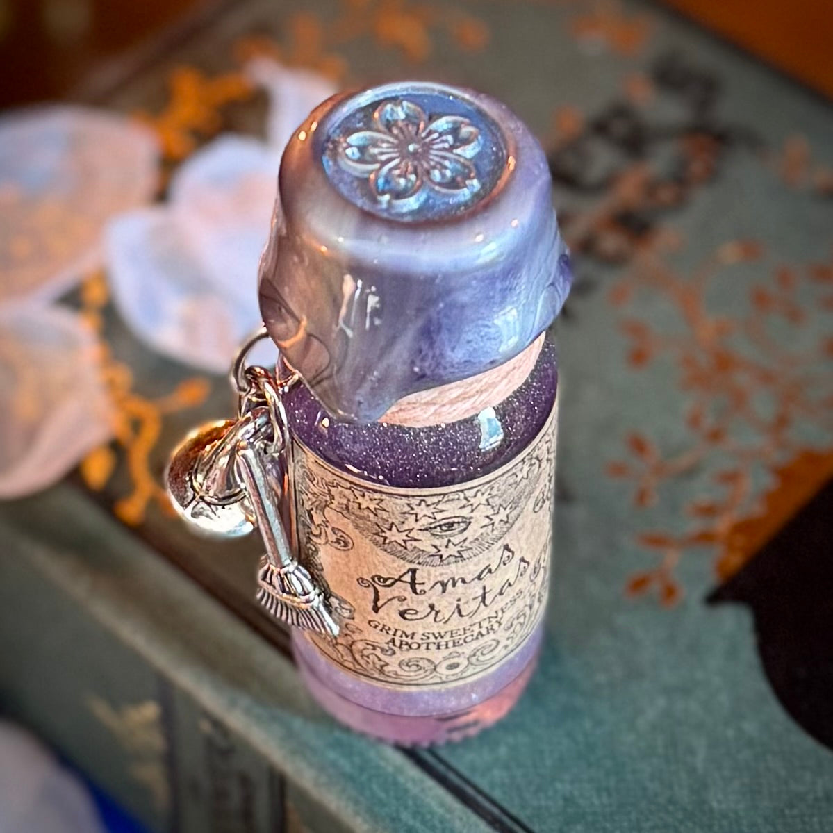 Listen, I know it's only March, but I'm so excited for the new Practical Magic movie coming this fall! Amas Veritas is the spell that Sally made as a girl, to repel true love, so she wouldn't have to feel the curse of heartbreak. We've made it into a detailed potion, and now a mini fidget potion! The mini will come with both the spell scroll (though not attached to the potion, as it wouldn't hold up to being tossed in a bag) and the parchment movie quote.