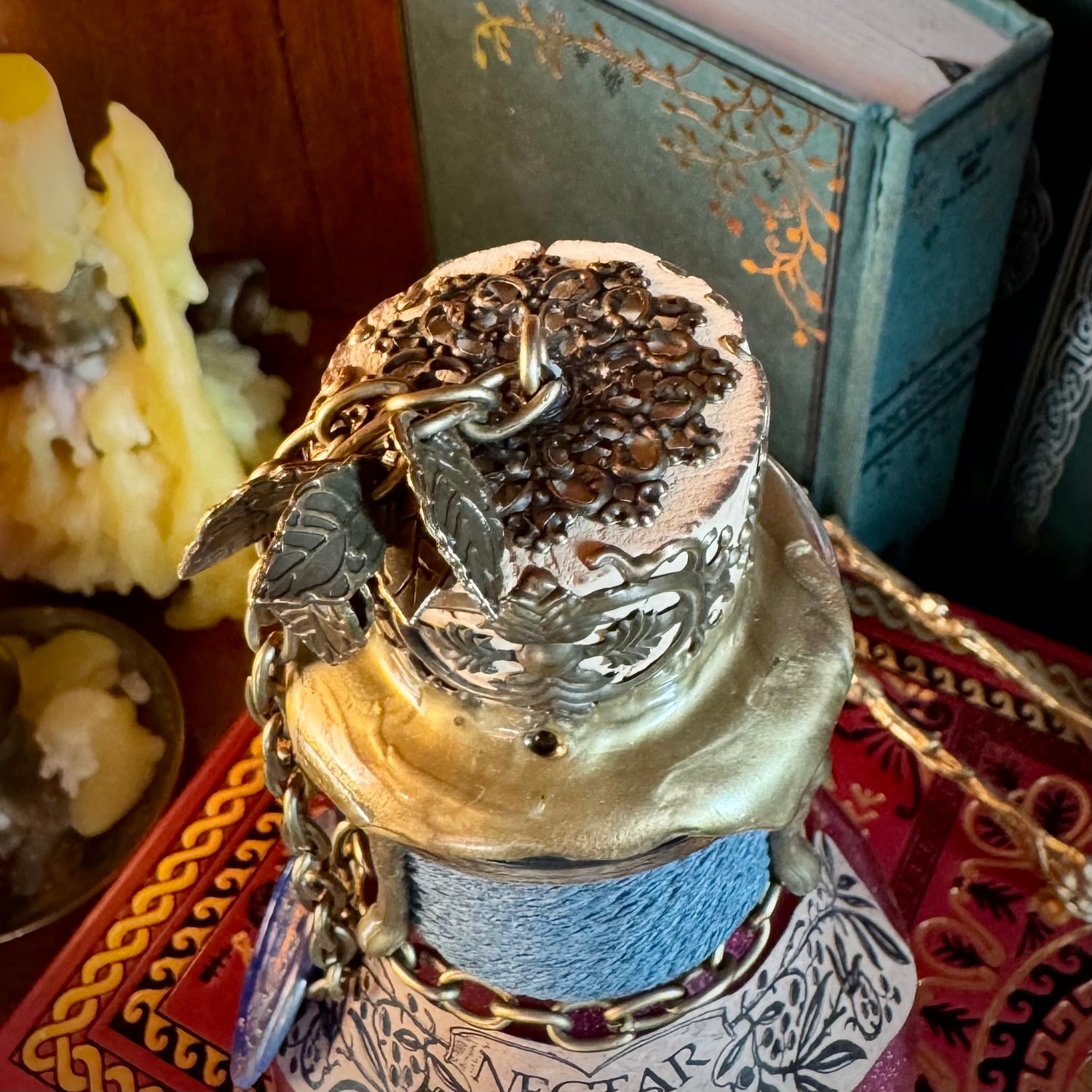 -Neck wrapped in aged dusty teal blue cord, and the bronze chain attached to the cork. Marbled blue and gold laurel wreath wax seal hangs from chain end.